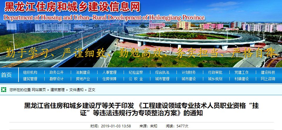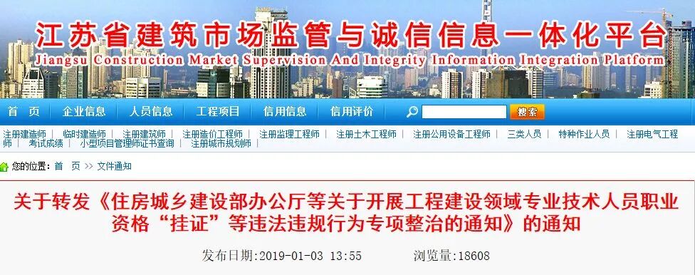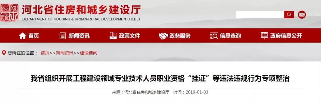 湖北省住建厅在2019年1月2日发布了《关于对工程建设领域专业技术人员职业资格“挂证”等违法违规行为进行自查自纠的公告》