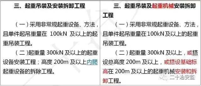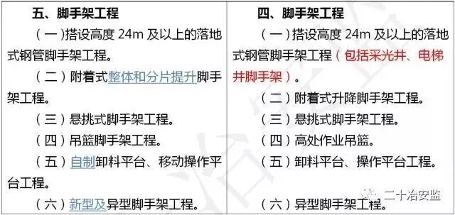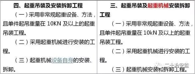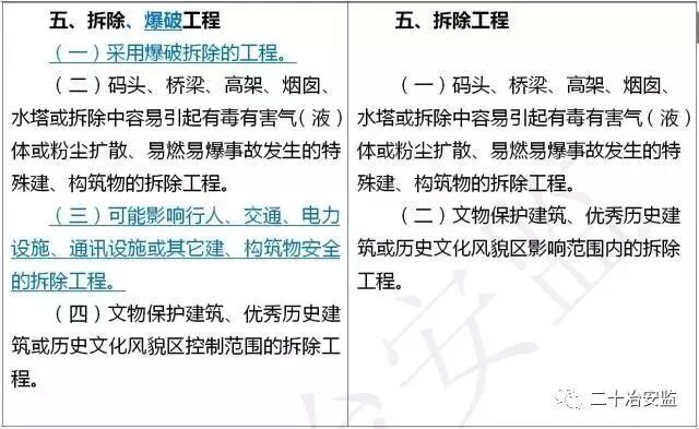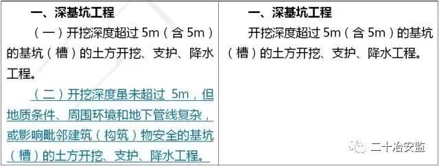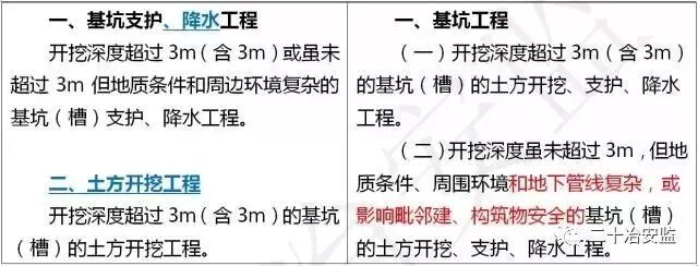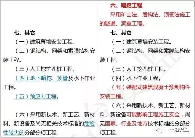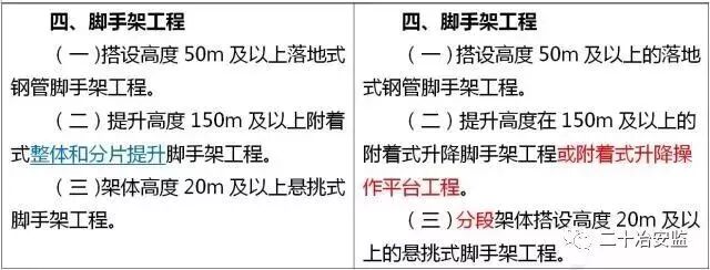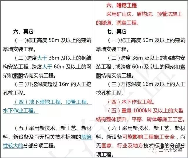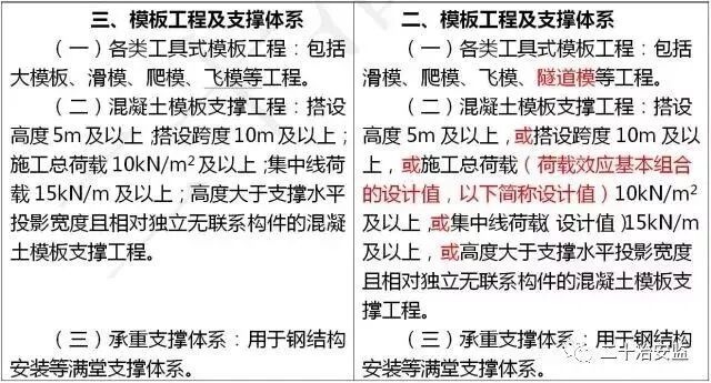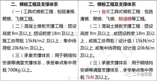 住建部在《危险性较大的分部分项工程安全管理规定》中要求: 对于超过一定规模的危大工程,施工单位应当组织召开专家论证会对专项施工方案进行论证。 具体范围如下: 超过一定规模的危险性较大的分部分项工程范围 一、深基坑工程 开挖深度超过5m(含5m)的基坑(槽)的土方开挖、支护、降水工程。 二、模板工程及支撑体系 (一)各类工具式模板工程:包括滑模、爬模、飞模、隧道模等工程。 (二)混凝土模板支撑工程:搭设高度8m及以上,或搭设跨度18m及以上,或施工总荷载(设计值)15kN/m2及以上,或集中线荷载(设计值)20kN/m及以上。 (三)承重支撑体系:用于钢结构安装等满堂支撑体系,承受单点集中荷载7kN及以上。 三、起重吊装及起重机械安装拆卸工程 (一)采用非常规起重设备、方法,且单件起吊重量在100kN及以上的起重吊装工程。 (二)起重量300kN及以上,或搭设总高度200m及以上,或搭设基础标高在200m及以上的起重机械安装和拆卸工程。 四、脚手架工程 (一)搭设高度50m及以上的落地式钢管脚手架工程。 (二)提升高度在150m及以上的附着式升降脚手架工程或附着式升降操作平台工程。 (三)分段架体搭设高度20m及以上的悬挑式脚手架工程。 五、拆除工程 (一)码头、桥梁、高架、烟囱、水塔或拆除中容易引起有毒有害气(液)体或粉尘扩散、易燃易爆事故发生的特殊建、构筑物的拆除工程。 (二)文物保护建筑、优秀历史建筑或历史文化风貌区影响范围内的拆除工程。 六、暗挖工程 采用矿山法、盾构法、顶管法施工的隧道、洞室工程。 七、其它 (一)施工高度50m及以上的建筑幕墙安装工程。 (二)跨度36m及以上的钢结构安装工程,或跨度60m及以上的网架和索膜结构安装工程。 (三)开挖深度16m及以上的人工挖孔桩工程。 (四)水下作业工程。 (五)重量1000kN及以上的大型结构整体顶升、平移、转体等施工工艺。 (六)采用新技术、新工艺、新材料、新设备可能影响工程施工安全,尚无国家、行业及地方技术标准的分部分项工程。 附:“危大工程范围”新旧对比