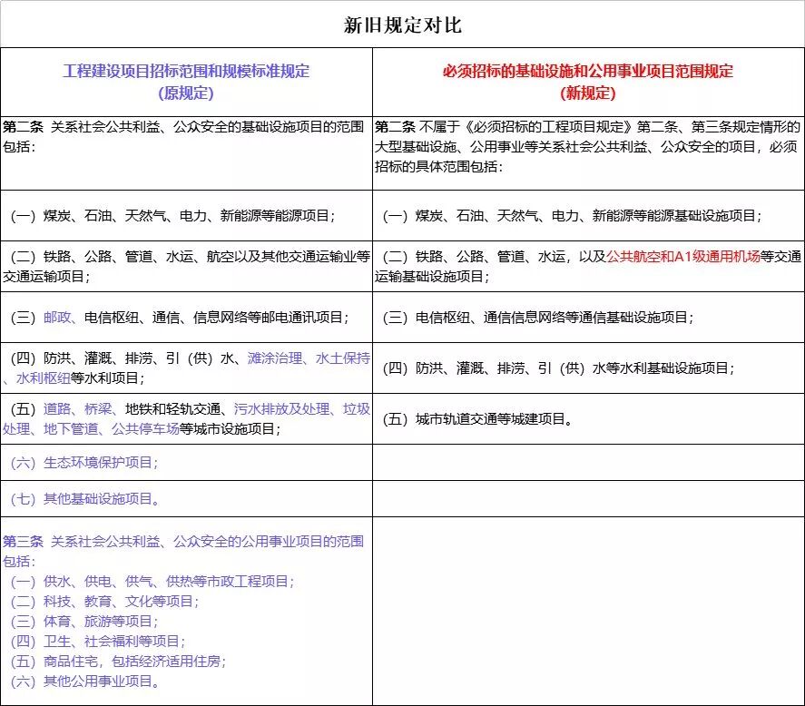 必须招标的基础设施和公用事业项目范围规定 第一条 为明确必须招标的大型基础设施和公用事业项目范围,根据《中华人民共和国招标投标法》和《必须招标的工程项目规定》,制定本规定。 第二条 不属于《必须招标的工程项目规定》第二条、第三条规定情形的大型基础设施、公用事业等关系社会公共利益、公众安全的项目,必须招标的具体范围包括: (一)煤炭、石油、天然气、电力、新能源等能源基础设施项目; (二)铁路、公路、管道、水运,以及公共航空和A1级通用机场等交通运输基础设施项目; (三)电信枢纽、通信信息网络等通信基础设施项目; (四)防洪、灌溉、排涝、引(供)水等水利基础设施项目; (五)城市轨道交通等城建项目。 第三条 本规定自2018年6月6日起施行。 (注:蓝色部分内容在新规定中被删除)